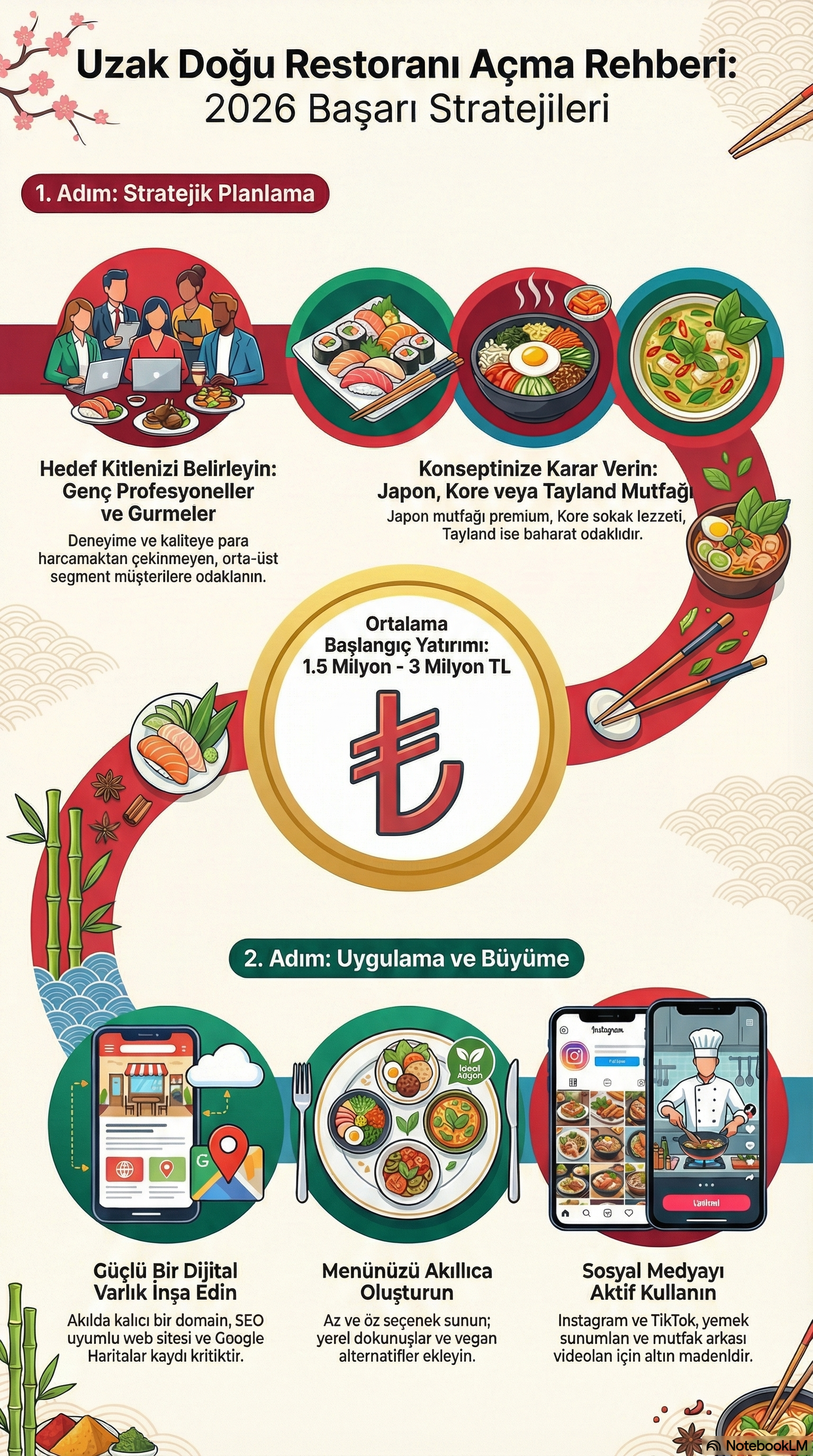 Lokasyon, başarının %50’sidir. Büyükşehirlerin gastronomi semtleri (İstanbul’da Kadıköy, Nişantaşı; Ankara’da Çankaya; İzmir’de Alsancak) uzak doğu mutfağı için idealdir. Ancak doğru konseptle Anadolu şehirlerinde de niş bir başarı yakalanabilir. Örneğin, üniversite çevresinde açılacak bir ramen bar, gençler arasında hızlıca popülerlik kazanabilir.